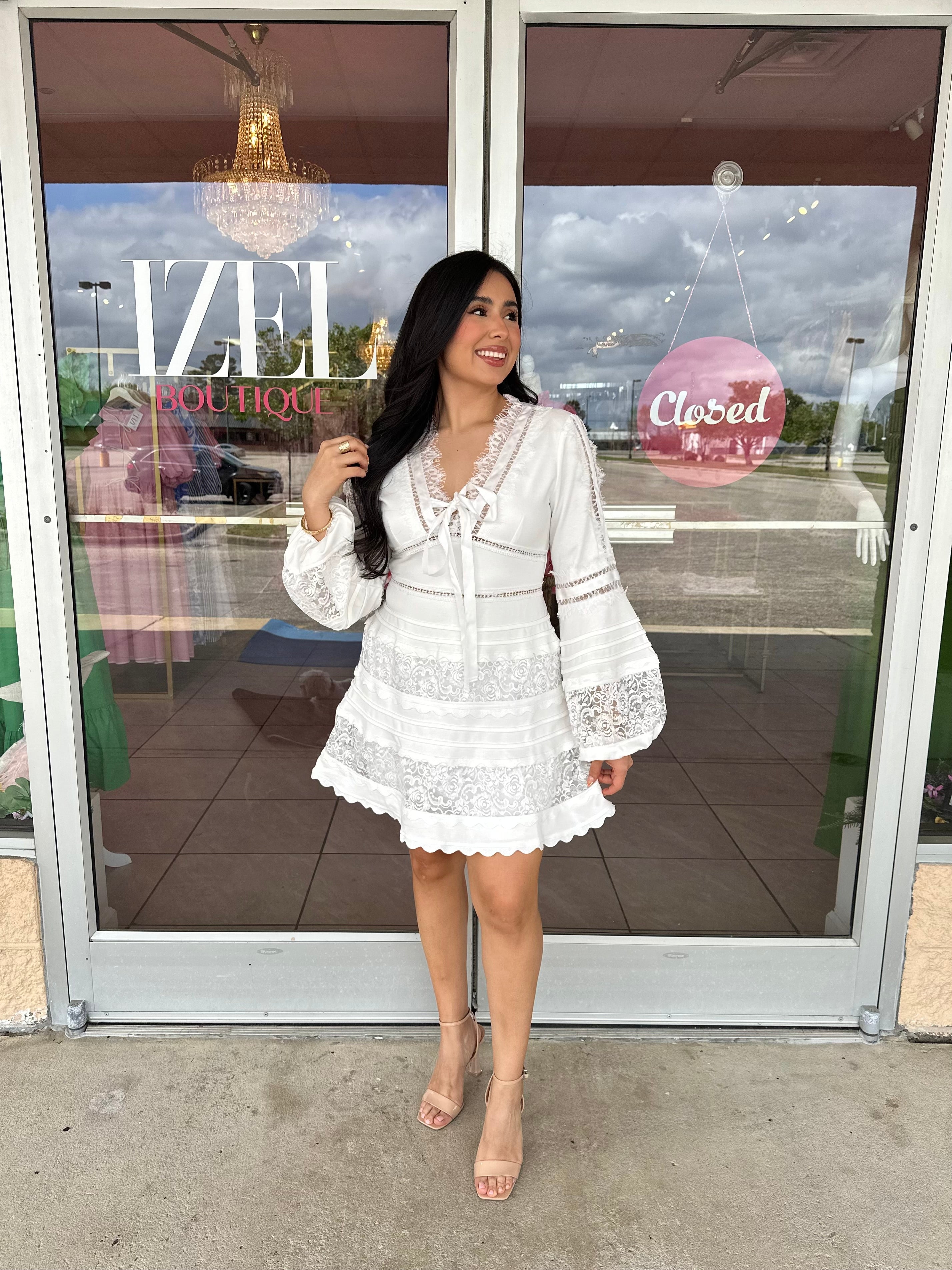 Elevate your wardrobe with this stunning Long Puff Sleeve V-Neck Tiered Lace Trim Mini Dress. Featuring a flattering V-neckline and intricate lace trim, this dress exudes both elegance and charm. The front bow detail adds a feminine touch, while the long puff sleeves with elastic cuffs create a dramatic, on-trend silhouette. Designed with both style and comfort in mind, the dress includes a hook-and-eye and hidden zip closure at the back for a seamless fit.