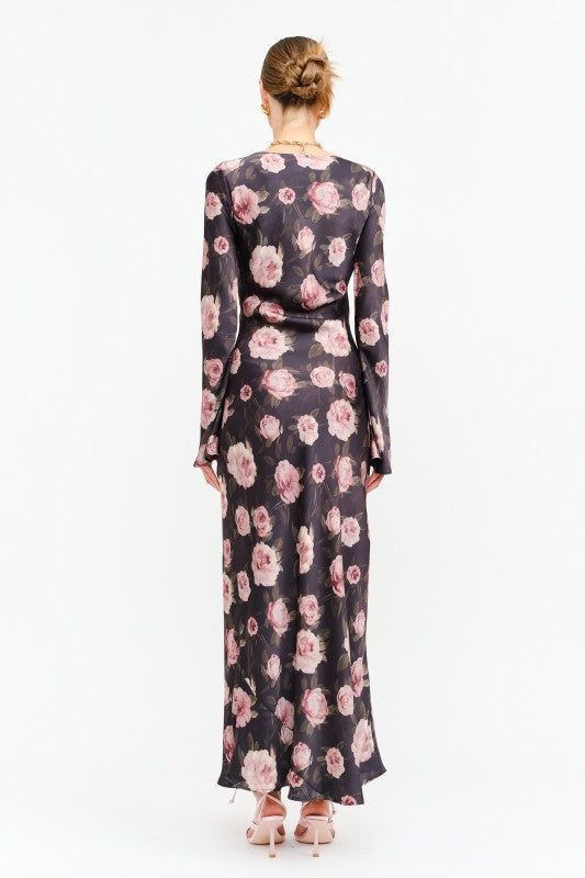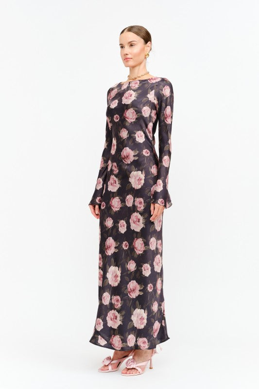 Georgie Floral Dress: Romance that lingers-this floral maxi dress is a poetic ode to timeless femininity. Crafted with a flowing silhouette and adorned in painterly blush roses against a rich black backdrop, it whispers elegance with every step. - Black base with allover blush rose print - Long sleeve, maxi-length silhouette - Round neckline - Lightweight, flowy fabrication Care Instruction: - Hand wash cold - Do not bleach - Line dry - Iron low if needed - Do not tumble dry Model is 5'11" and is wearing a size small