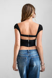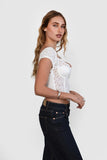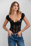 Turn up the charm with our Hailey Lace Bustier Top — a romantic blend of femininity and edge.Featuring a flattering sweetheart neckline with delicate lace trim, supportive underwire, and boned panel construction for a sculpted fit. The short stretch cap sleeves and asymmetrical curved hem add a touch of drama, while the sheer lace fabric and low square back with ruched band detail keep things irresistibly flirty. Perfect for date nights, concerts, or dressing up your favorite denim.