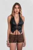 Fierce meets flirty in ourMegan Halter PU Halter Top — the ultimate statement piece for a bold night out.Crafted from soft, stretch vegan leather, this top features a plunging V neckline supported by sleek halter straps and a sultry exposed lace detail down the center front. The low open back adds an extra dose of drama, making it perfect for turning heads wherever you go. Pair it with high-waisted denim or a mini skirt for an edgy, elevated look.