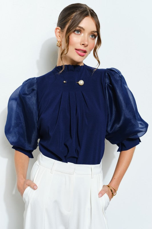This elegant blouse features a high neckline adorned with delicate pleats, creating a refined and graceful silhouette. Sheer organza puff sleeves add soft volume and femininity, while pearl and metal embellishments at the collar bring a polished, luxe finish. The relaxed fit drapes beautifully, offering both comfort and elevated style.