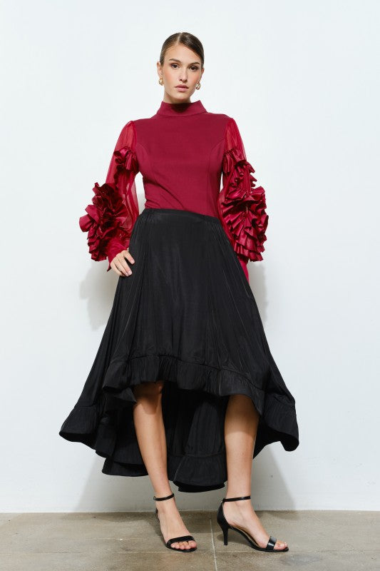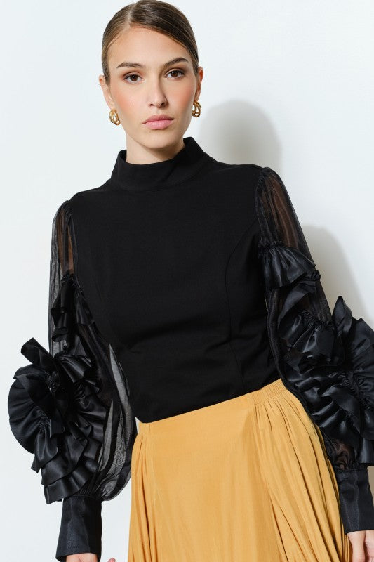 Romantic detail meets modern sophistication in the Rosette Ruffle Sheer Sleeve Jersey Top. Designed with a soft, body-contouring jersey bodice, this piece offers a flattering, tailored fit that feels as good as it looks. The contrast sheer sleeves bloom with dimensional rosette ruffles crafted from lustrous fabric, creating a sculptural statement with every movement.