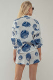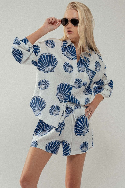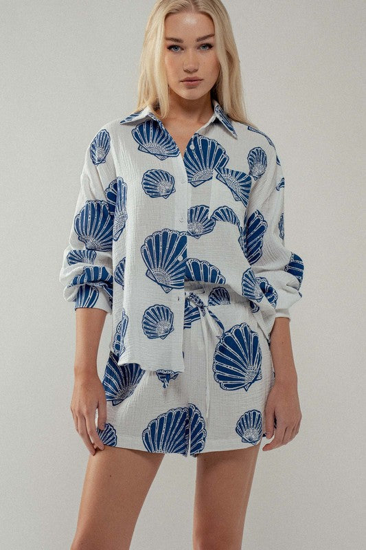 This boho-inspired set features a relaxed button-down shirt and matching drawstring shorts, both adorned with a bold blue shell print. Crafted from lightweight, breathable cotton gauze, this set is perfect for summer days, casual outings, or a beach-ready look. - Boho set with playful shell print for standout summer style. - Soft, airy cotton fabric keeps you cool and comfortable. *Fit : Relaxed, loose fit with adjustable drawstring waist on shorts for comfort and easy movement.
