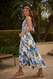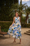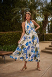 Effortlessly flirty and fresh, the Zurie Floral Niam Smocked Midi Dress is perfect for the laidback beauty who loves a touch of elegance. Featuring soft blue and green floral prints on a crisp white backdrop, this dreamy dress showcases a plunging halter V-neckline and an open back for that carefree, sun-kissed vibe. The smocked waistband cinches just right for a flattering fit, while the lightweight lining keeps things breezy and comfortable. Pair with woven heels or sandals for the ultimate daytime-to-dinner look.